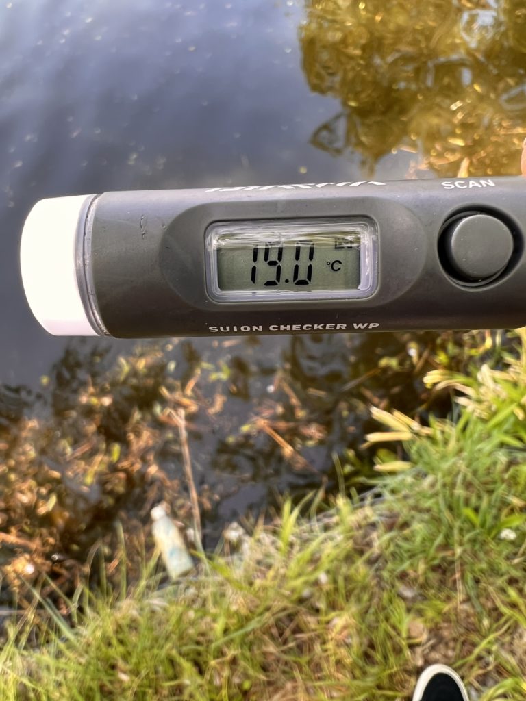 水温は毎回計るようにしています。本日は19度。スモールマウスバスにとってはいい水温ですね。ちなみに一日前は20度でした。本日は曇り気味で釣りにしてはいい天気だったように思います。