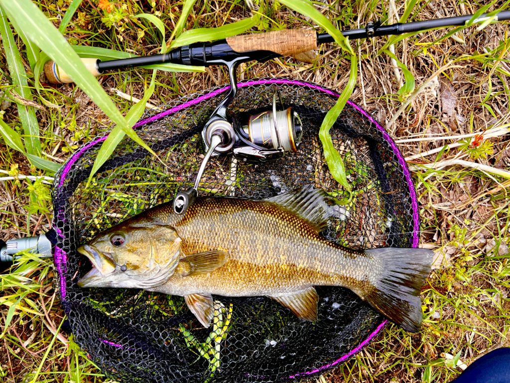 結果は30センチちょいのスモールマウスバス1ッ匹つり上げに成功しました。