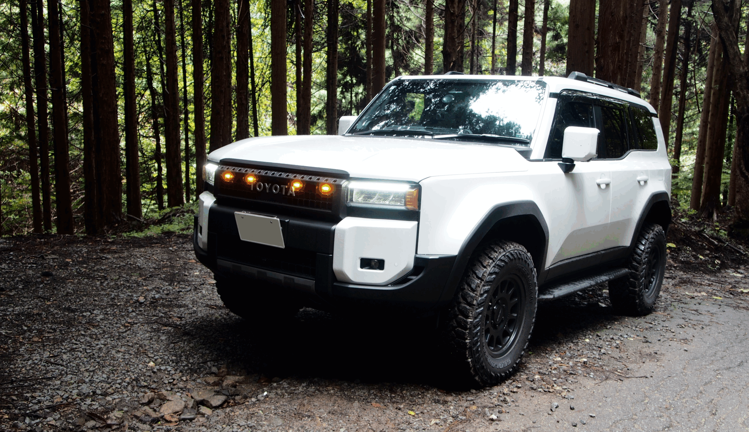 今回のカスタムは、ランクル250の「ブラックグリル」+「グリルマーカー」装着、それに加えて泥除け(マッドフラップ)も外したという組み合わせ。